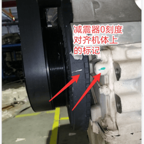 注意:对每个缸执行第二步的制动间隙调整之前,都需按照以下要求进行角度校准,确认减振器零刻度线正对机体上指针且第6缸位于压缩上止点,(见下图1缸压缩上止点再转一圈就是第6缸的压缩上止点)