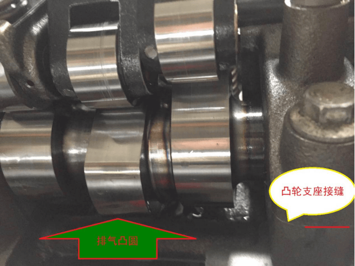 缸内制动间隙逐缸调整,看排气凸圆中间位置与凸轮轴支座接缝处平齐时如图:4所示此时可调整该缸缸内制动间隙。