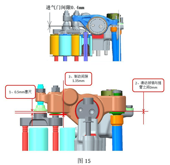 排气门及制动阀间隙调整方法:见图15。