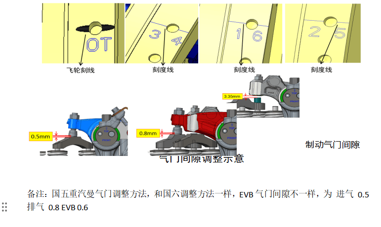 a.面向飞轮从OT线逆时针盘车72°至飞轮外边缘刻线标记“1 6”,检查1缸进气间隙是否可调,如可调,调节第1、2、4缸进气门间隙0.5mm,调节第1、3、5缸排气门间隙0.8mm,用专用工装调节6缸制动摇臂间隙3.35mm。如1缸进气间隙不可调,直接执行步骤d的间隙调节,然后顺推。